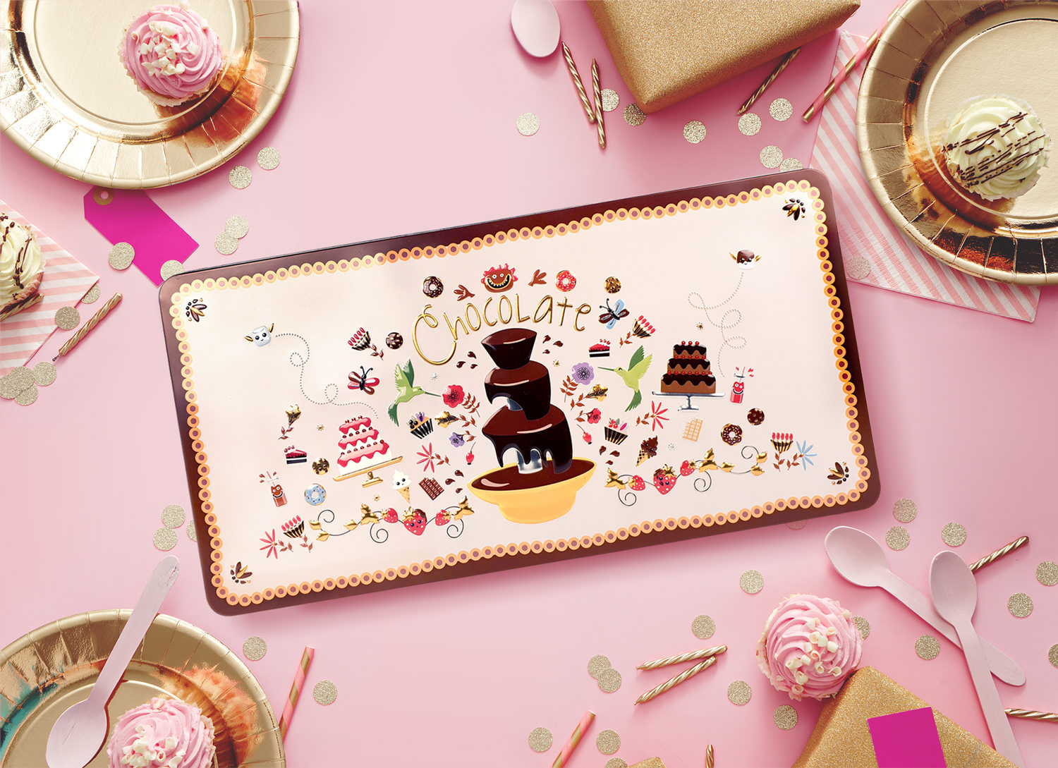 For Kmart’s Belgian Chocolate Tin, I created a playful and celebratory packaging design that positioned confectionery as a giftable product. The tin featured a bold central illustration paired with scattered festive motifs, balanced with gold foil details to add a sense of luxury while keeping the tone approachable. This combination of whimsy and refinement made the product an appealing seasonal standout in Kmart’s confectionery range.