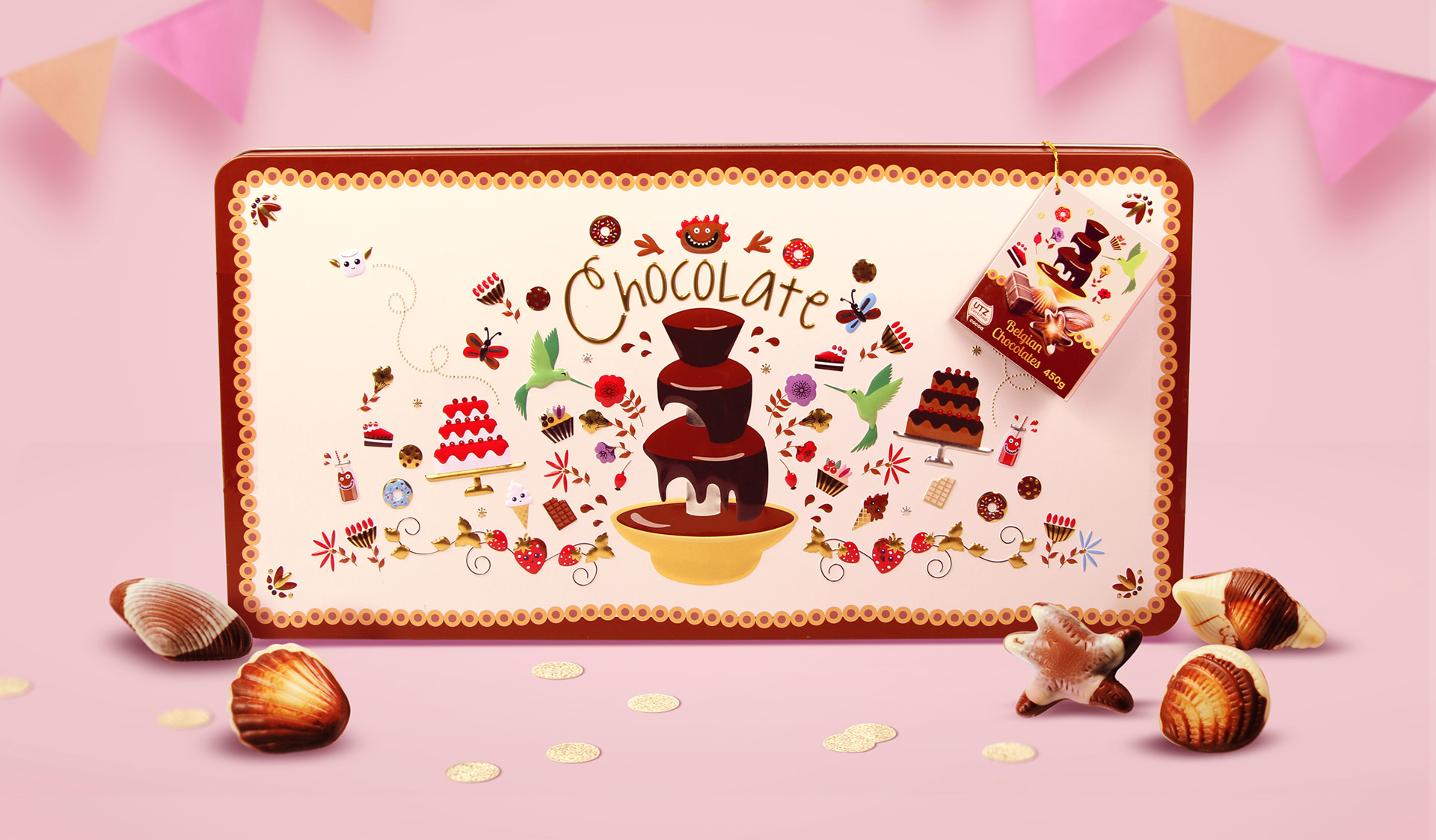 Playful packaging design and festive illustration for Kmart’s Belgian Chocolate Tin, turning confectionery into a seasonal gift.