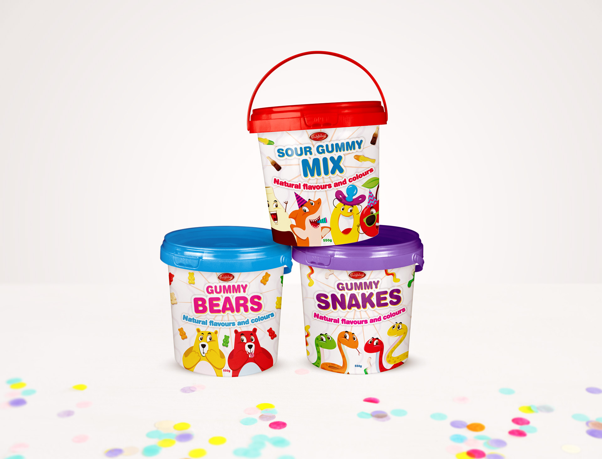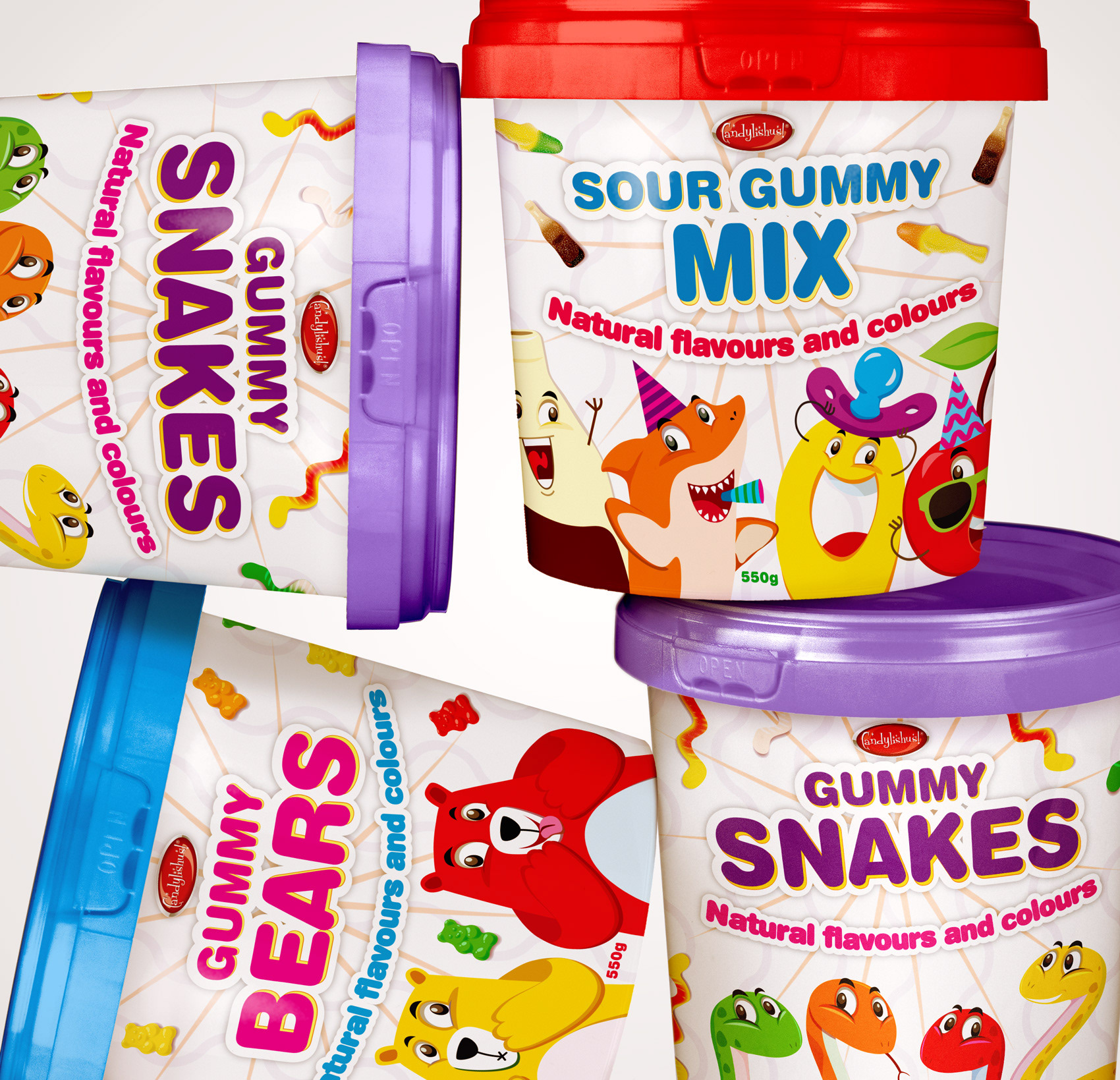 For Big W’s confectionery tubs, I created a suite of bold, character-driven illustrations that gave each flavour its own personality — from cheeky gummy bears to lively snakes. The designs emphasised fun and approachability while making the tubs stand out on crowded shelves. Alongside illustration, I styled and photographed the packaging to highlight its colourful energy. The result is a packaging range that feels joyful, accessible, and memorable for family audiences.