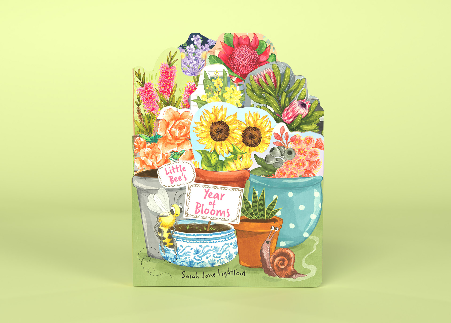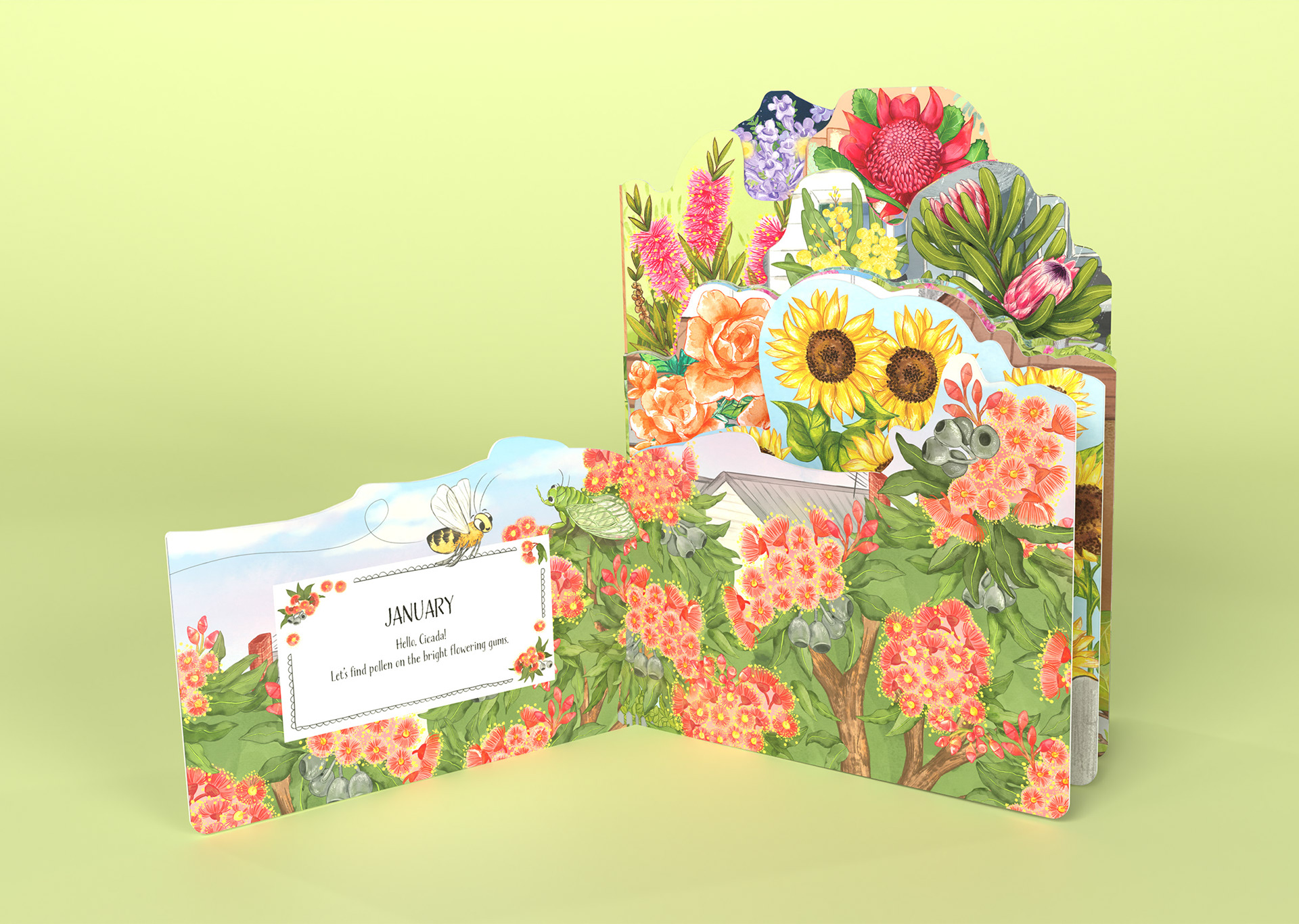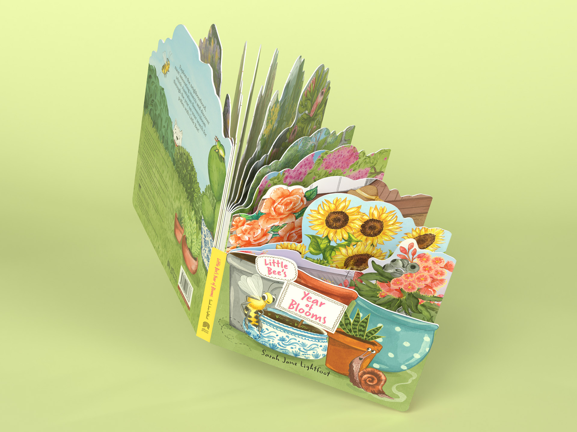 Little Bee’s Year of Blooms is a die-cut board book designed to guide young readers through the seasons, celebrating Australian flora, pollinators, and the changing natural world. I worked across illustration, book design, and 3D presentation to bring the tactile, sculptural qualities of the book to life. Each spread features richly layered illustrations and organic shapes that invite exploration, while the die-cut form creates a playful silhouette that evolves as the pages turn. The artwork balances warmth and detail with clarity for young audiences, supporting both storytelling and early visual engagement.